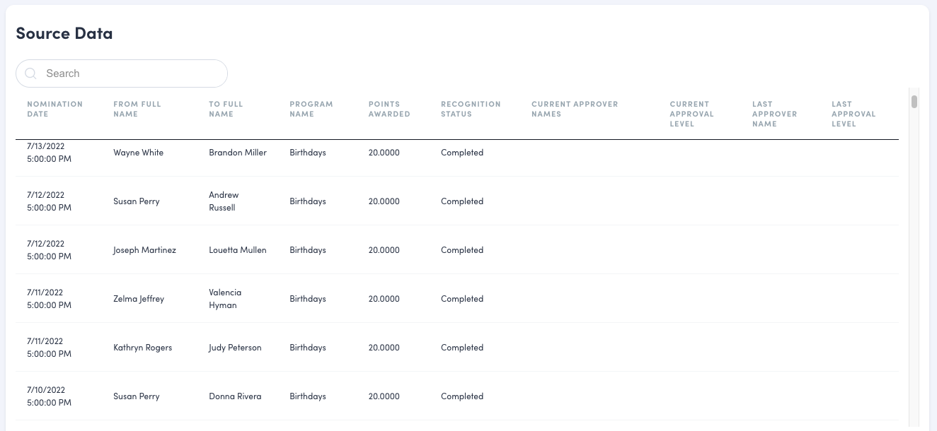 At the bottom of the page you’ll find the raw data that the data visualizations draw from above. If you were to export the report to a .csv/JSON file, this is the same format you would find. Use the search bar to search for keywords such as employee names, recognition status, and approver names.