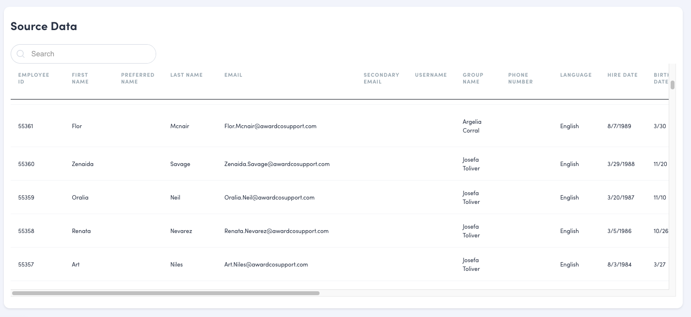 At the bottom of the page you’ll find the raw data that the data visualizations draw from above. If you were to export the report to a .csv/JSON file, this is the same format you would find. Use the search bar to search for keywords such as employee names, languages, and roles.