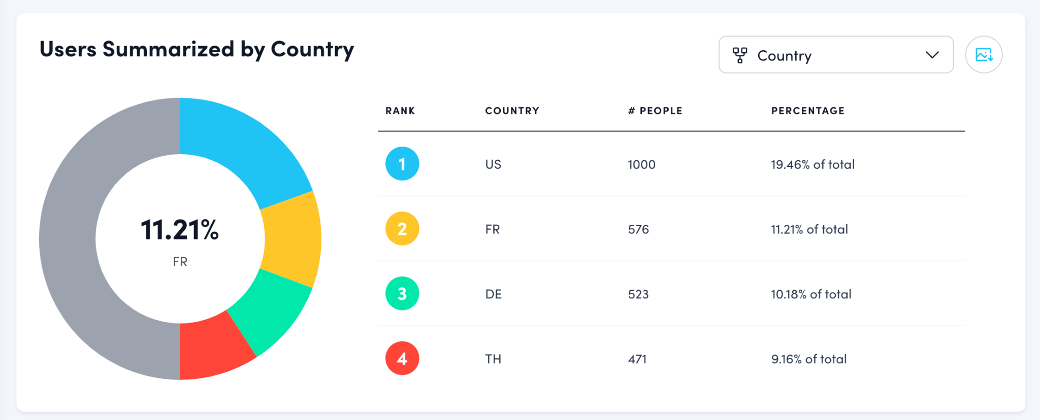 This section shows a pie chart that summarizes approval data from different filter categories presented in the drop-down menu to the right of the graph title. The initial filter applied here is Country. Note: Data for Active users will only be shown in all contexts in this summary. Archived Users are not counted for.