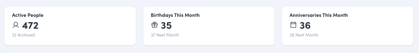 Right below the data filters you’ll see 3 tiles with the data metrics: Active People, Birthdays This Month, and Anniversaries This Month. The number of archived users will show below the number of active people, and the number of upcoming birthdays and anniversaries will show below the number of birthdays and anniversaries that month.