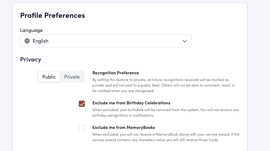 This article explains how to mark your birthday as private within the platform. Choosing this option will exclude you from the automated birthday recognition program, and your birthdate will not be visible to any administrators or managers in the system.