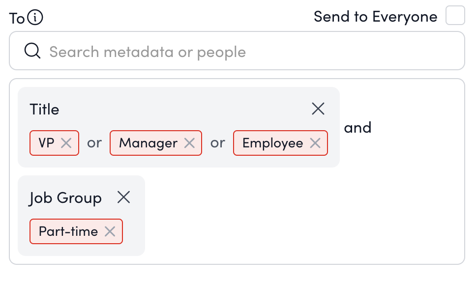 - If multiple metadata values of the same category are selected, the logic will assume an ‘or’ statement. For example, the email will be sent to any user with the ‘VP’ or ‘Manager’ tag under the #Title metadata field. On the other hand, if you select multiple metadata values from different categories, the logic will assume an ‘and’ statement. For instance, the email will be sent to any user with the ‘Employee’ tag under the #Title metadata field and the ‘Part-time’ tag under the #Job Group metadata field.