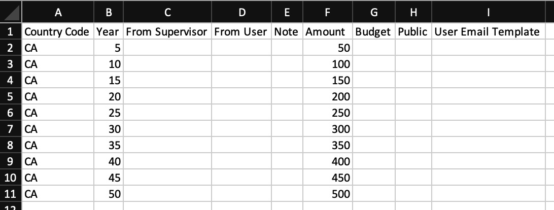 User Email Template - In this field, enter the name of the template that you would like to send to the employee celebrating the anniversary. The value entered here will need to match the name of the template exactly. While this field is not required, we recommend working with the Awardco team to build and utilize an email that will celebrate your employee. As discussed in the "Amount" section, we recommend sending an email to every user, including those who are not receiving a monetary amount. We firmly believe there is never a bad time to celebrate an employee's contributions to your organization, especially when they are celebrating the completion of another year with you.