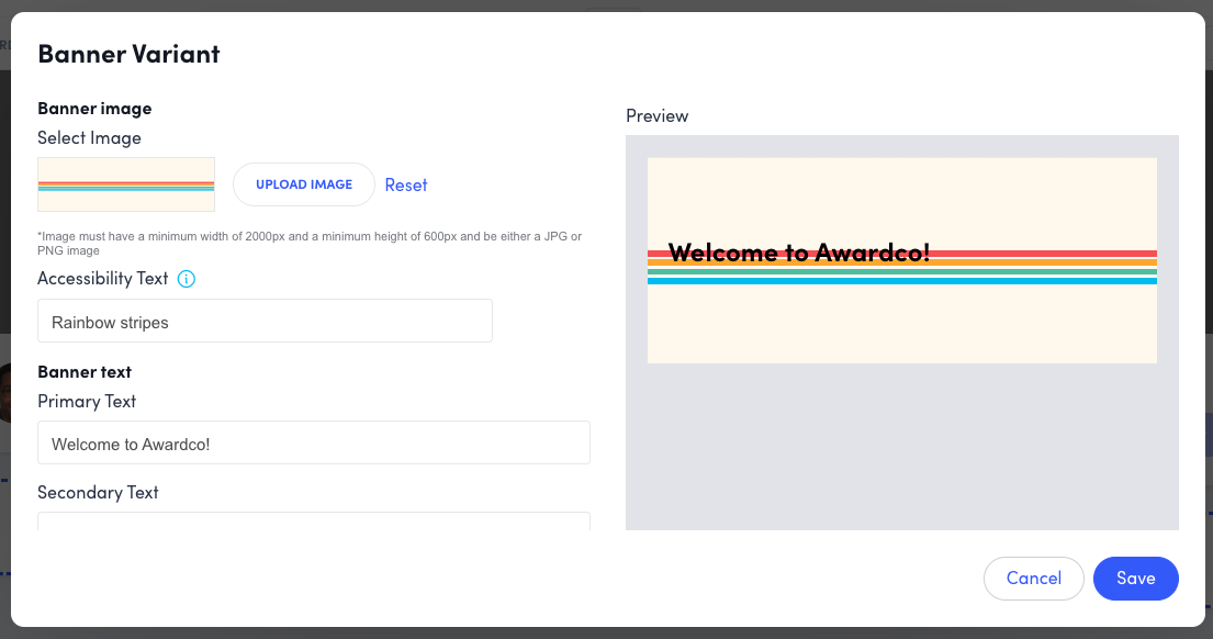 Enter accessibility text to provide a brief image description for users with visual impairments. Utilize the “Primary Text” and “Secondary Text” fields to add custom text that overlays the image. You can adjust the text alignment to left, center, or right and choose the text color (black or white). Once you're happy with the banner settings, click “Save.”