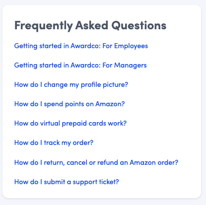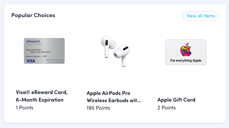 This widget showcases popular redemption items, giving employees insight into how others are using their points. The three displayed options will vary based on your organization's available redemption options. To add this widget, select “Add Content” on the right side of the homepage (not available for the left side), click “Add” next to “Popular Choices,” and the widget will appear at the bottom of the right section. Clicking “View All Items” will direct the user to the “All” section of the Spent Points Landing page, displaying all available options in your organization’s Award Network.