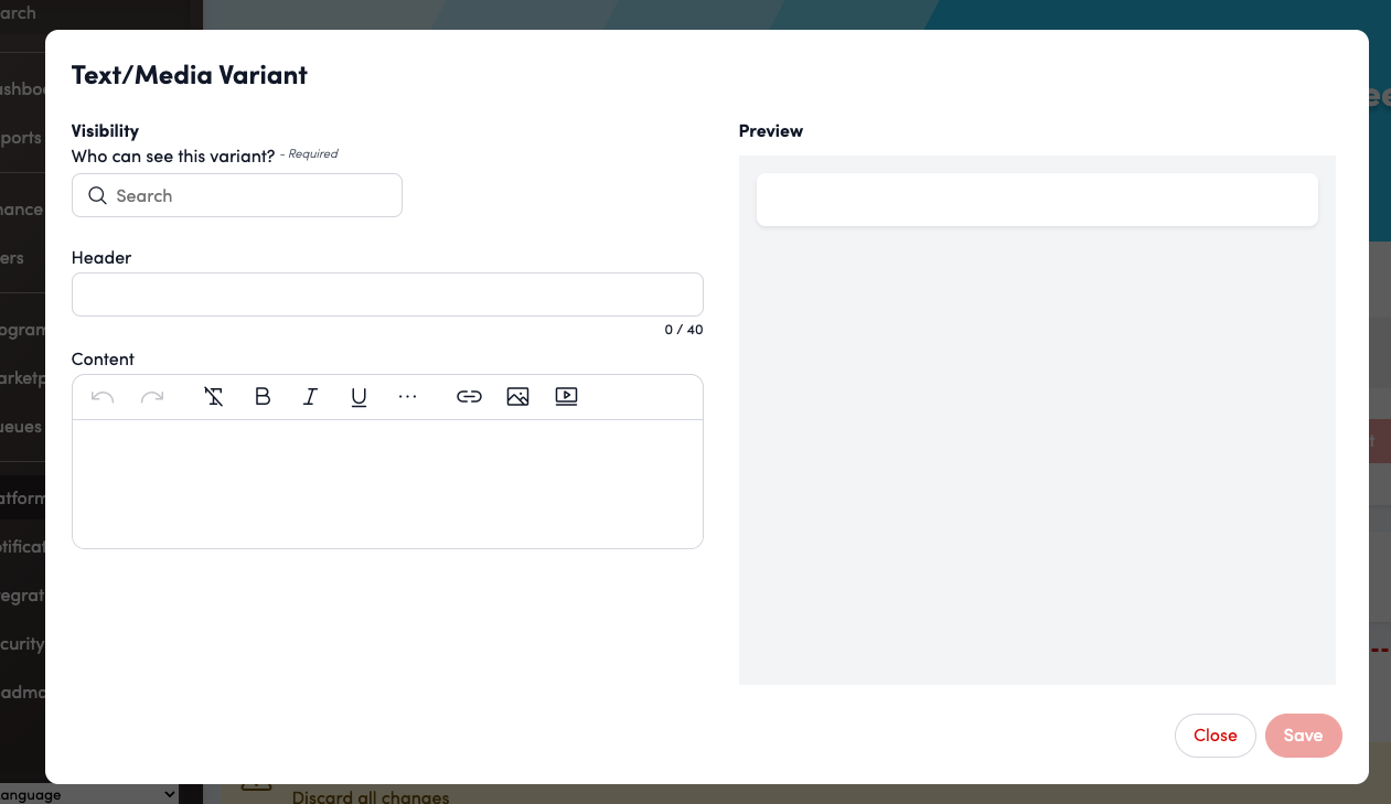 To add a Text/Media widget variant, click “Add Variant” and select the metadata tag. Next, specify the metadata value(s) that apply to the employees who should see this specific widget. Apply your desired text and media settings and click “Save.” Repeat these steps for each metadata value requiring a different Text/Media widget. Delete variants by selecting the trash can icon.