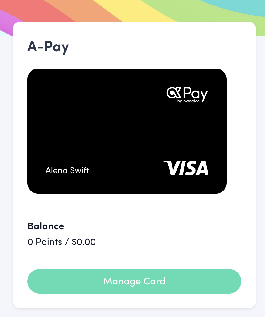 A-Pay is a virtual or physical card directly linked to your Awardco point balance. It seamlessly integrates with our Lifestyle Spending Account feature, enhancing your ability as an admin to manage subscriptions and memberships. To enable the A-Pay widget, navigate to the "Add Content" section on the left side of the page and click "Add" next to "A-Pay". This will display a widget on the homepage, allowing users to view their A-Pay purchasing power, card details, and spending limits.