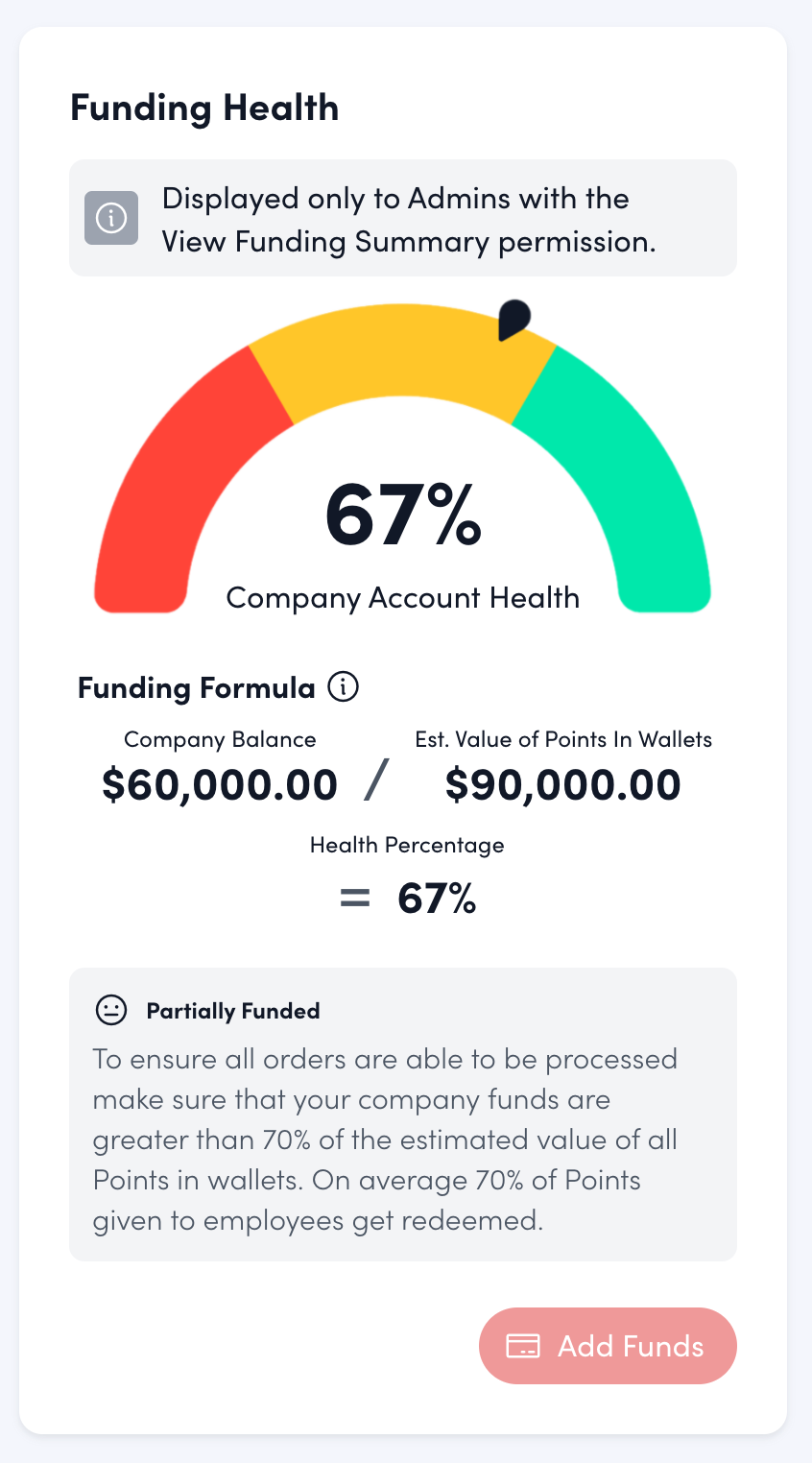 This widget is visible only to Admins with access to the Billing Page and provides a snapshot of the company account's funding status. It helps admins quickly assess their funding by comparing total funds against outstanding points in employee wallets. This increased transparency helps prevent platforms from zeroing out funds, ensuring employees can always redeem their points. Select “Add Content” on the left side of the page and click "Add" next to "Funding Health".