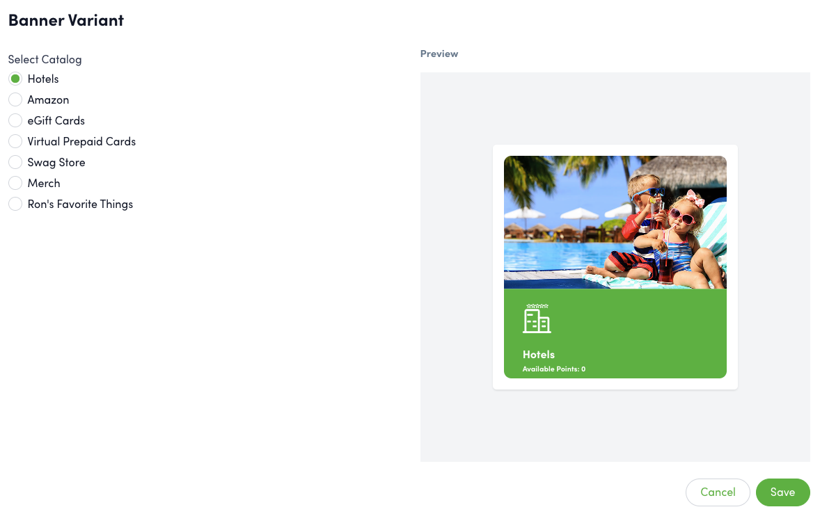 This widget allows you to promote specific catalogs on the homepage, including existing redemption options (Amazon, gift cards, etc.) or custom catalogs. The widget can be placed on either the left or right side of the page. Click Add Content and select the Catalog Banner widget. You can then choose from the available redemption options. The preview will show how the widget will appear based on its placement on the homepage. Once you've selected your catalog, you can add variants as needed. Position the widget on the homepage and publish your changes. Employees will now see this catalog displayed on the homepage.