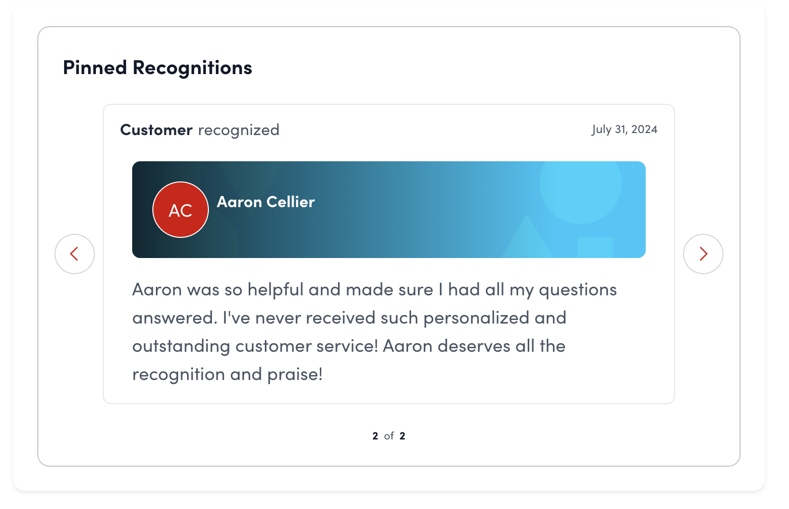 Pinning recognitions is a great way to highlight important recognitions in a scrolling carousel at the top of the recognition feed. Refer to the Social Recognition Feed Settings article for instructions on enabling this feature.