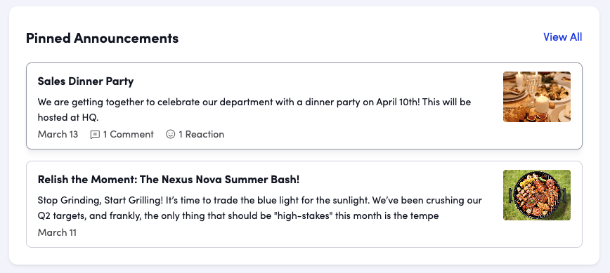 If your organization uses the Company Announcements feature, this widget highlights pinned announcements on the homepage so employees can easily see important updates and open a pop‑up modal to view the full announcement in the platform.