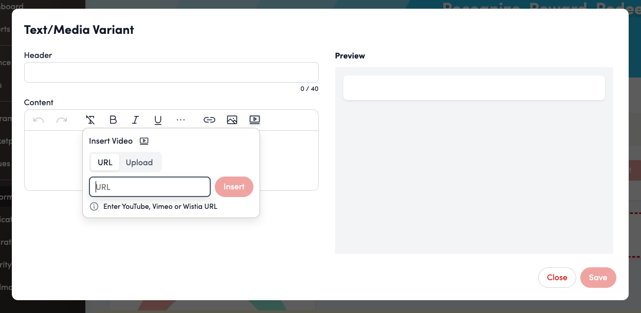 Enter the header text that will appear at the top of the widget. Use the rich text editor to format your text. You can add images by uploading them (minimum width of 1200px) or by embedding videos. You can now add multiple images to a single Text/Media widget.