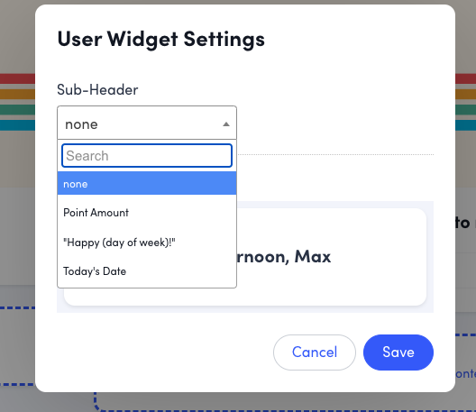 This widget displays the user's profile photo and a personalized greeting. Clicking the pencil icon allows you to add a sub-header below the greeting. Sub-header options include: point balance (“You Have 250 points to spend!”), a day-specific greeting (“Happy [day of the week]!”), and the current date (“Monday, September 19, 2022”). Selecting “none” will only display the greeting. The greeting will also congratulate users on their service anniversaries or birthdays.