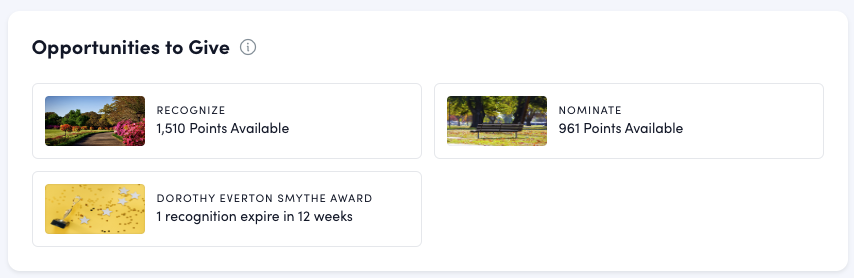 This widget provides direct access to the recognition form. Users with recognition program access can easily begin recognizing others without needing to click the “Recognize” tab at the top of the screen. Once recipient names are entered, the platform will direct the nominator to the screen displaying the applicable recognition programs.