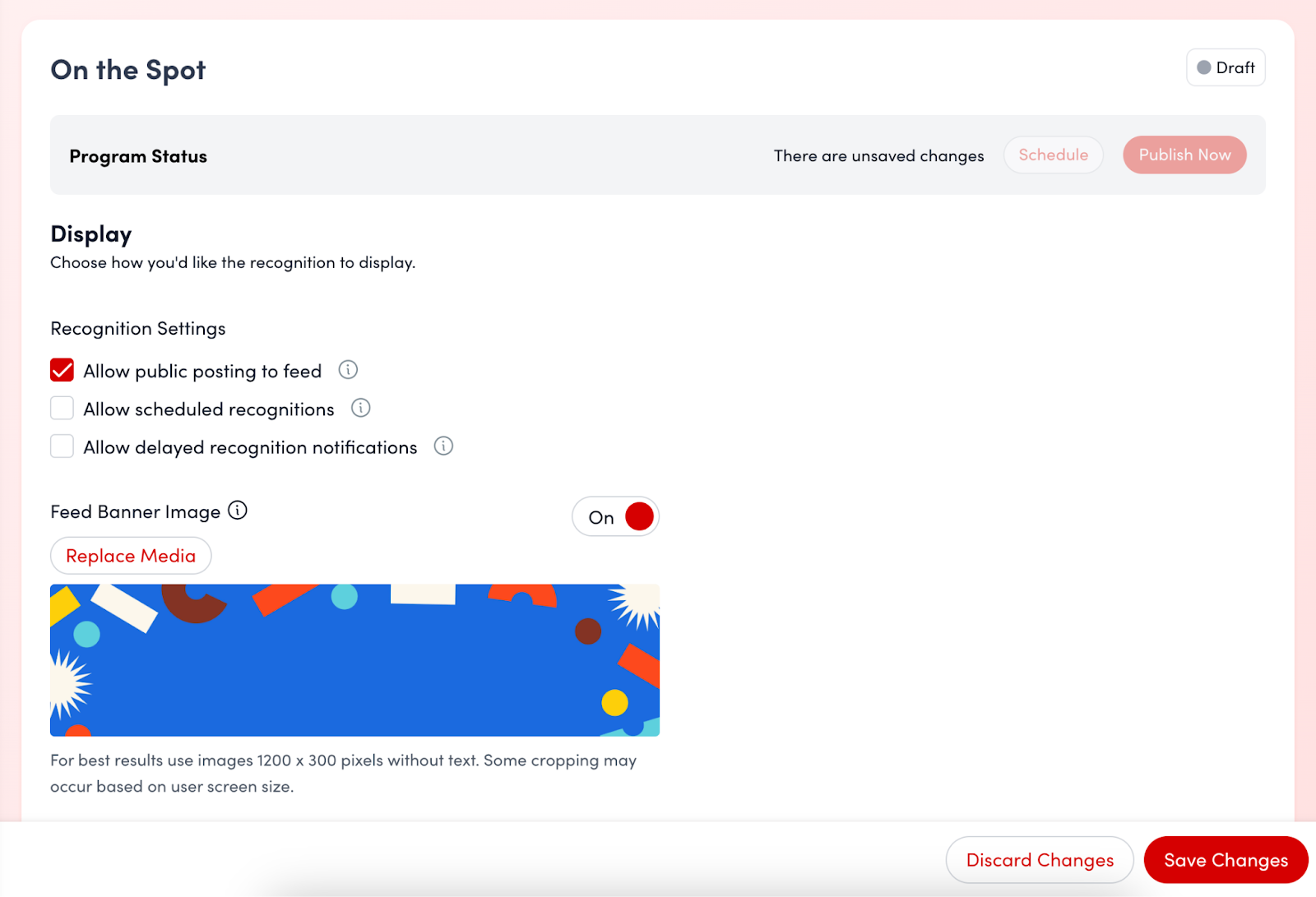 - Banner Image: Toggle this on if you want a banner image to appear on each recognition in the social feed. For optimal results, use images that are 1200 x 300 pixels without text.