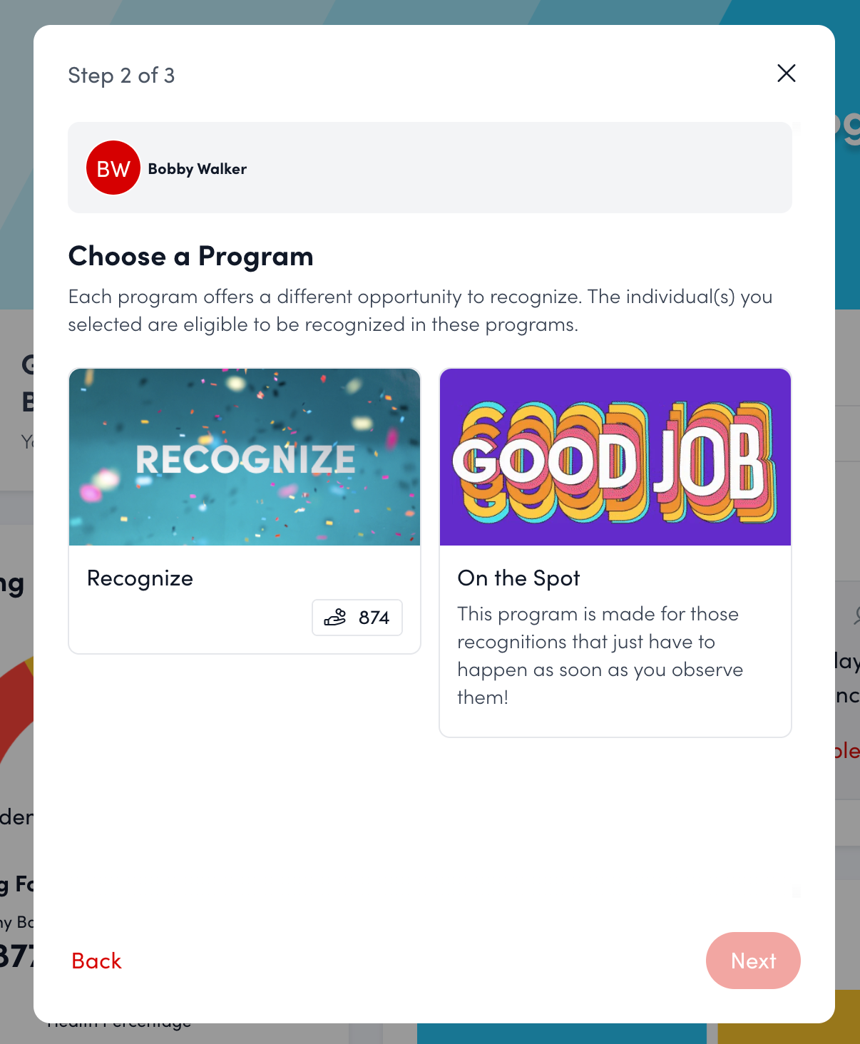 Test the front-end view of your recognition program by selecting Return at the top right of the screen. Click the Recognize button on the homepage and enter the name(s) of the individuals you would like to recognize. Select your newly created program and click Next.