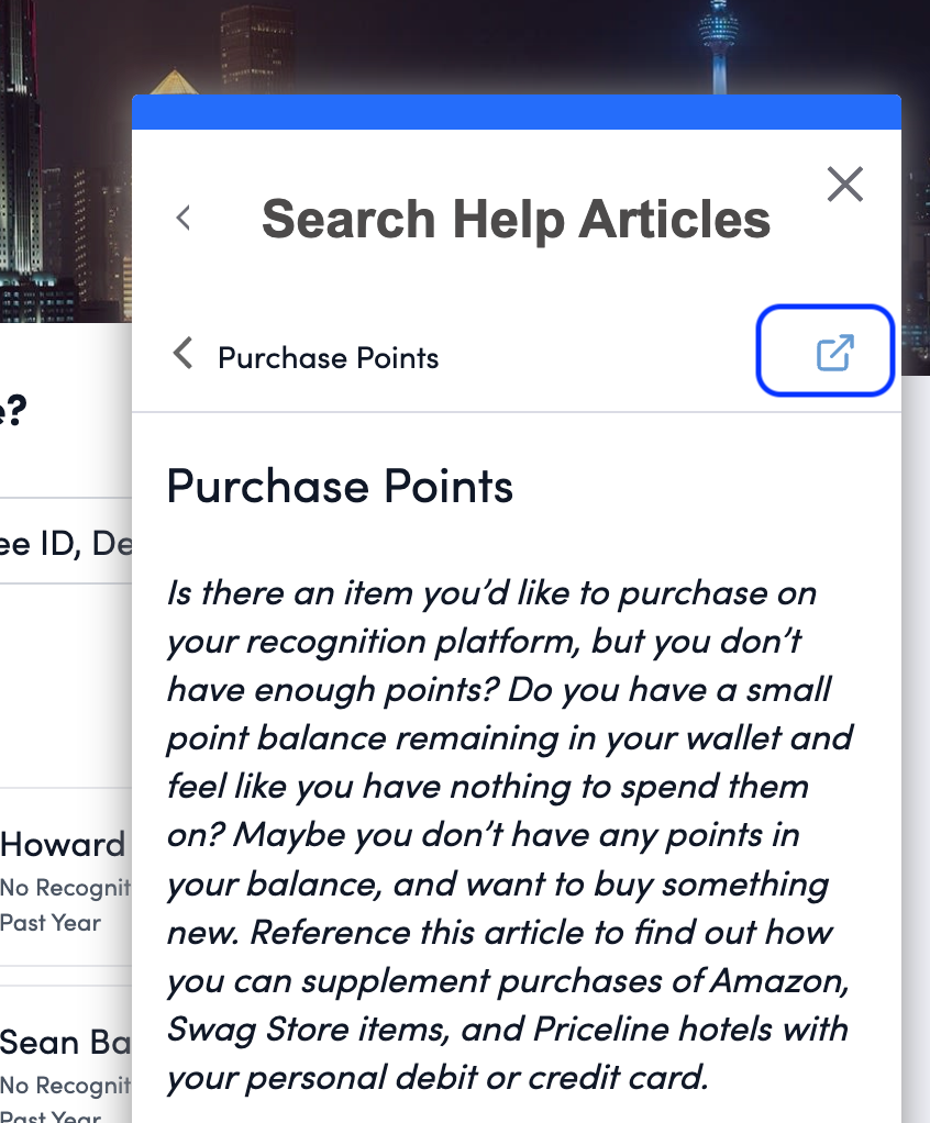 This section allows you to seamlessly access our extensive knowledge base without having to leave the platform. Use the search bar to discover insightful articles tailored to your context—whether you are looking for tips on sending a recognition, participating in a survey, or checking your point balance. These articles provide just-in-time solutions to potential obstacles. Click the icon to the right of an article title to view an enlarged version.
