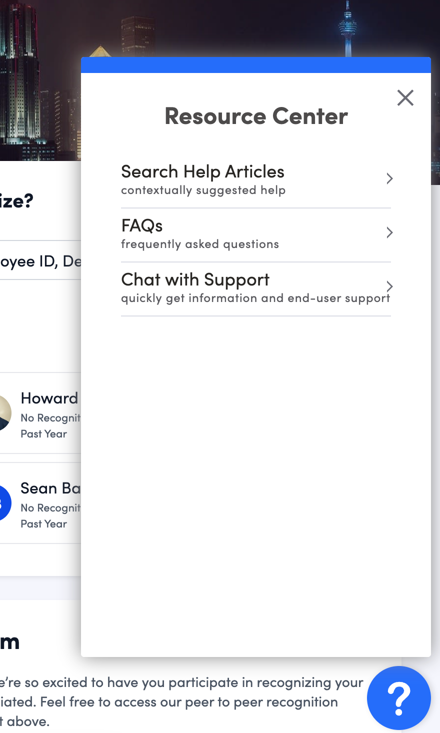 The Awardco Resource Center is your go-to hub for comprehensive support. Our resource center is designed to assist you in finding the answers you’re looking for regarding platform navigation, recognition programs, surveys, and order management. Click the question mark icon in the bottom right corner of the screen to get started!