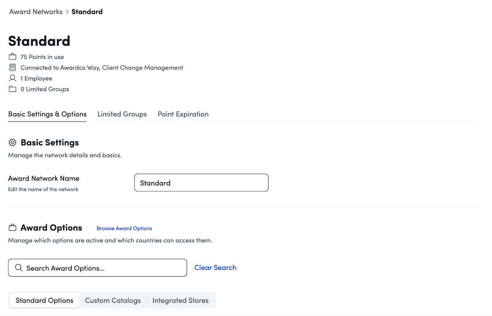 - Click a specific Award Network your employees use to spend points on charitable donations.