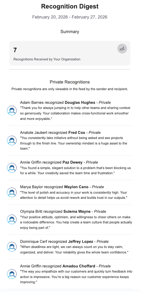 The Recognition Digest is a weekly summary email that consolidates all recognitions received by a selected group of people from the previous seven days.