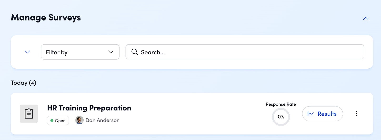 Track Real-Time Participation: You can monitor your overall response rate directly from the Surveys Landing Page. If you have multiple surveys running, use the built-in filters to quickly find the specific project you’re looking for. For a deeper dive, you can filter participation rates by: