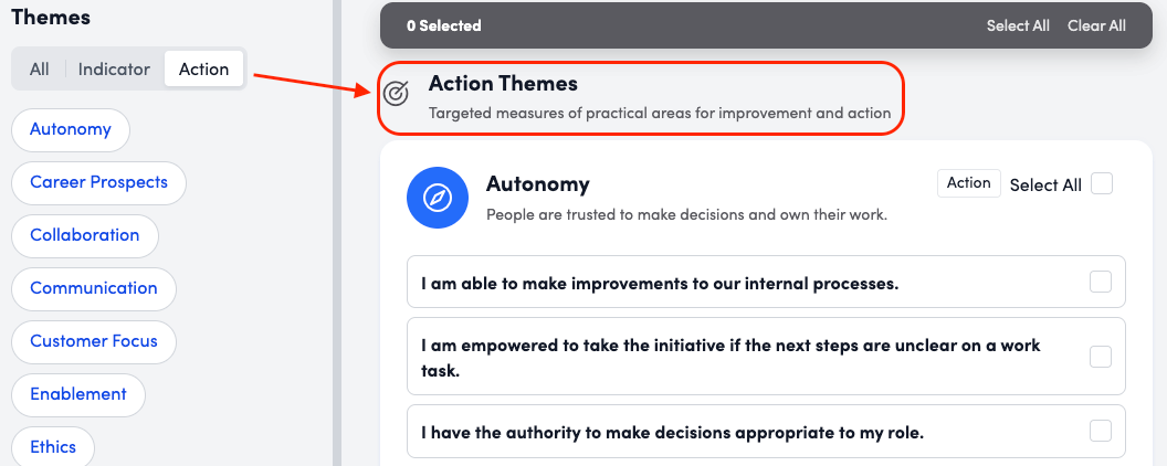 * NOTE: You must include at least one Indicator (Engagement) question from above in your survey. The platform needs this to show you how each Action Theme, from below, affects your overall score. Action questions do not compare against each other. Without an Indicator question, you will not know which specific actions will actually improve engagement.