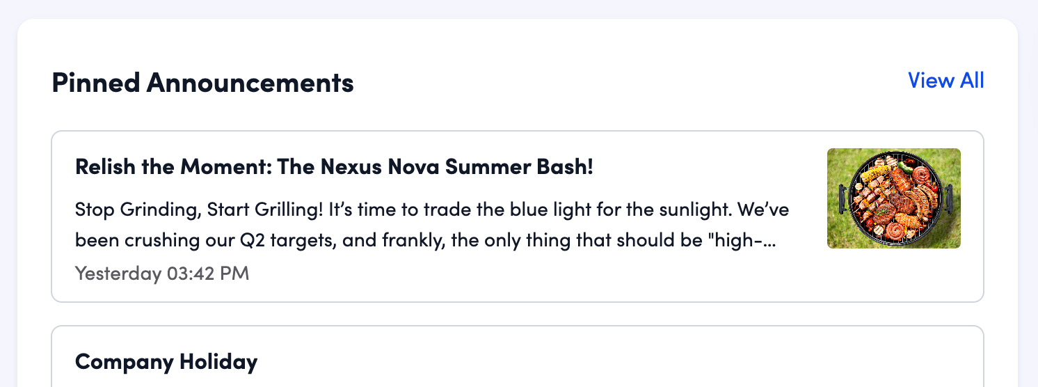 - Pinned announcements will appear in a dedicated widget on the homepage so employees can find them easily (see Pinned announcements on the homepage).