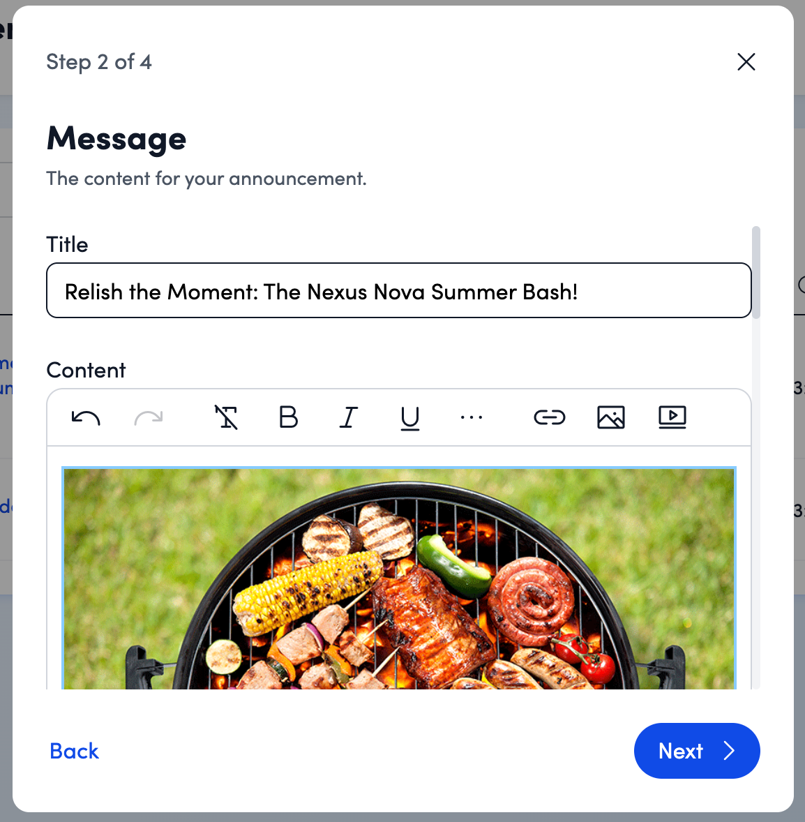 - Insert images or videos if they help people understand the message (such as a banner, chart, or short explainer video).