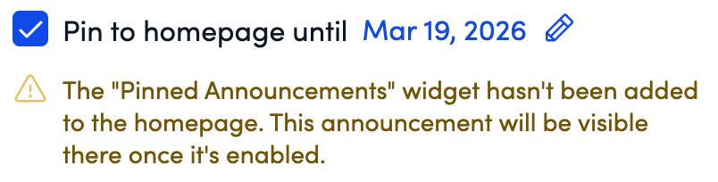 NOTE: If the "Pinned Announcement" widget is missing from your homepage, you will see the notice below. See the Pinning Announcements on the Homepage section for setup instructions.