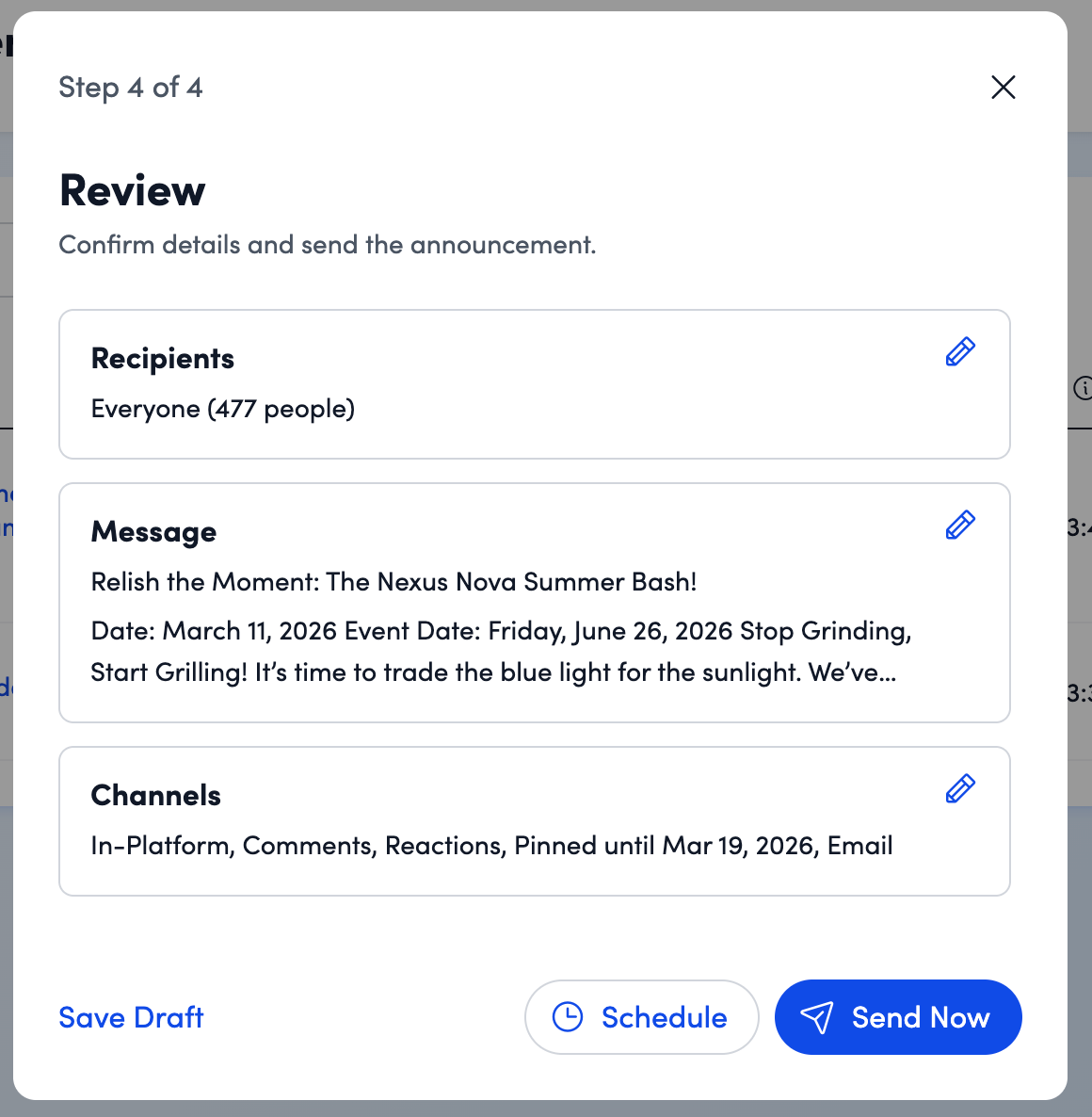 - Save the announcement as a draft if it is not ready to send. You can come back later to edit the content, audience, and schedule before sending.