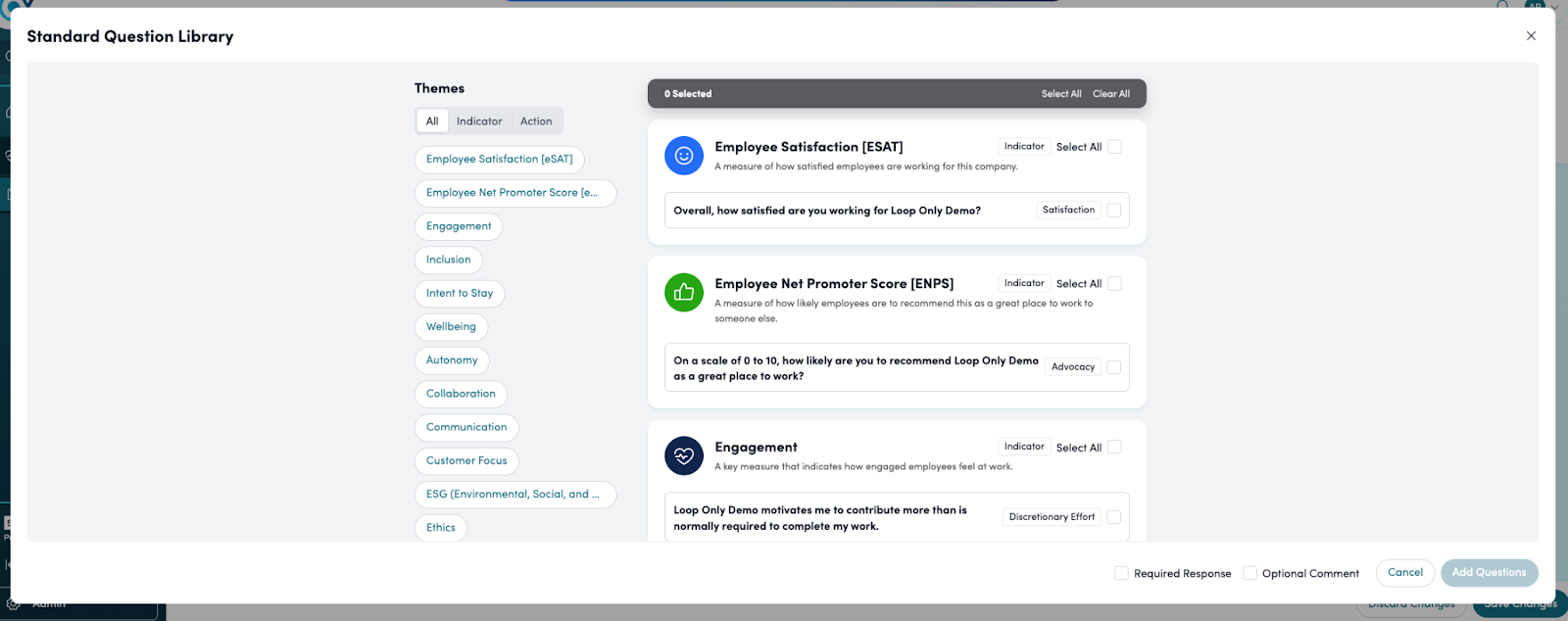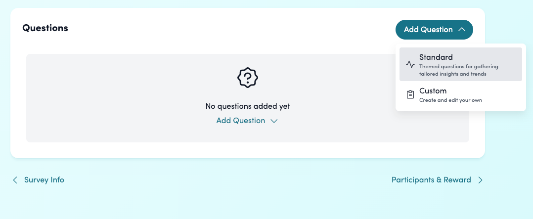 - Standard: Utilizes a library of themed questions designed to measure tailored insights and trends.