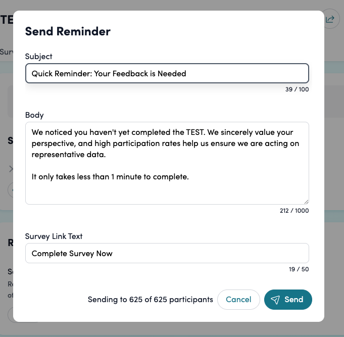 While the survey is in draft status, the option to send reminders is disabled. Once the survey is published (Open Status):
