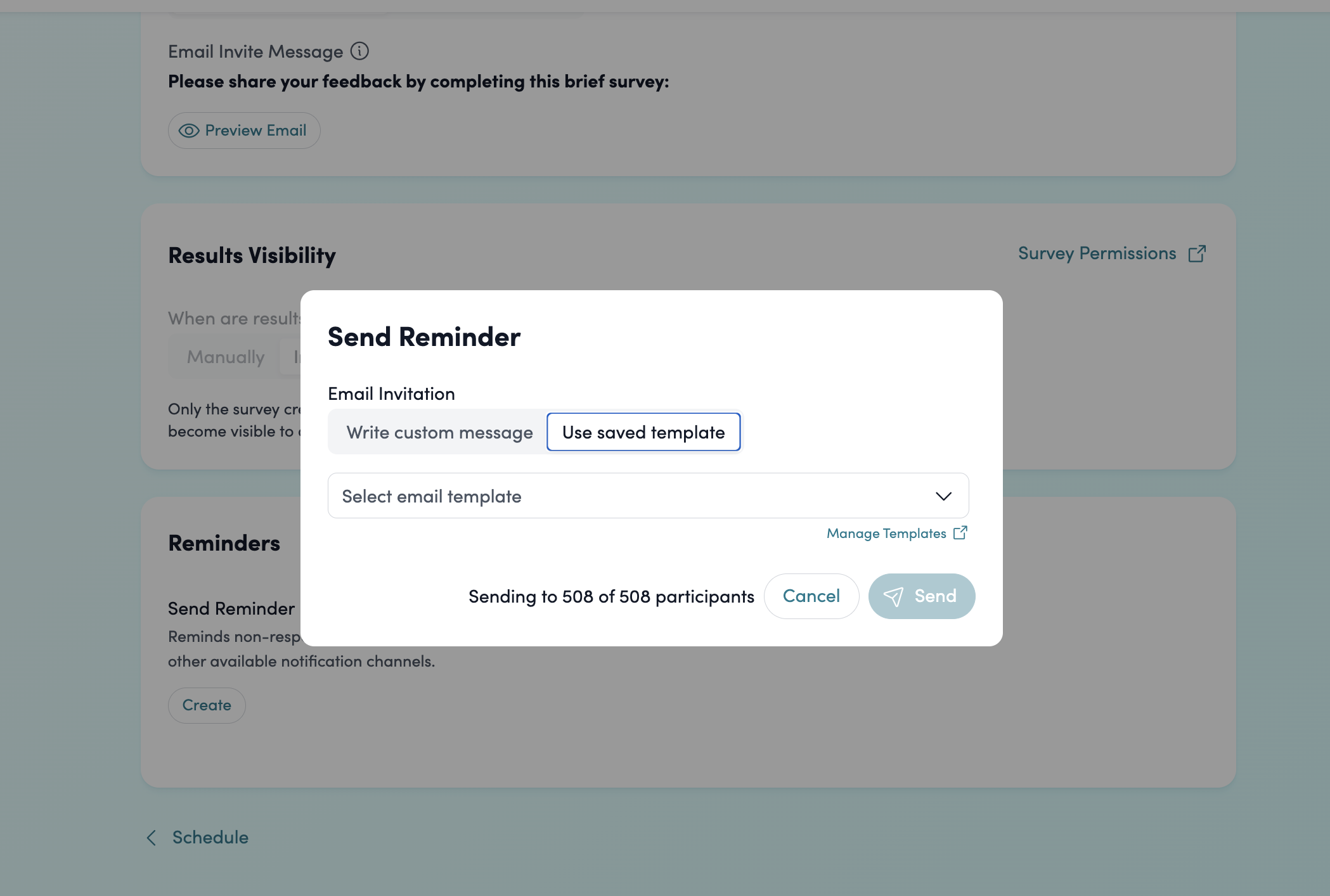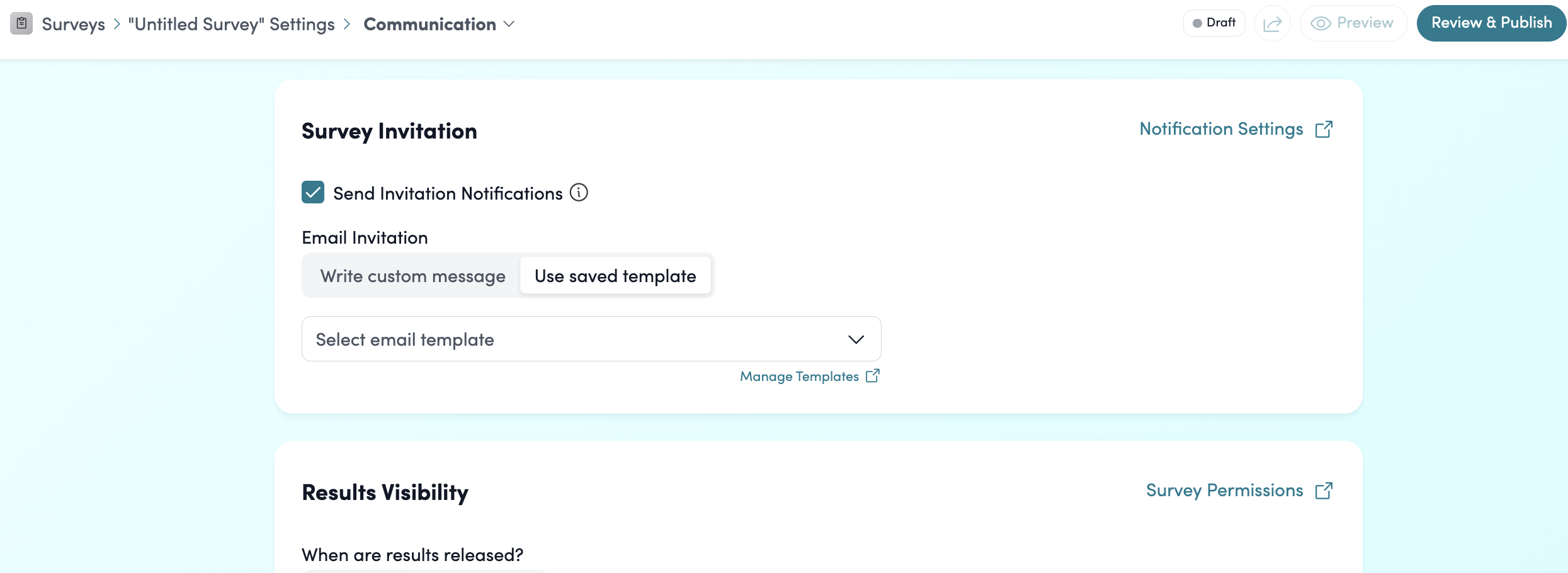 - Note: The "Write Custom Message" email template is not currently editable and will display: "New Survey Available: [Survey Title] [Survey Description]" and include a button to the survey.
