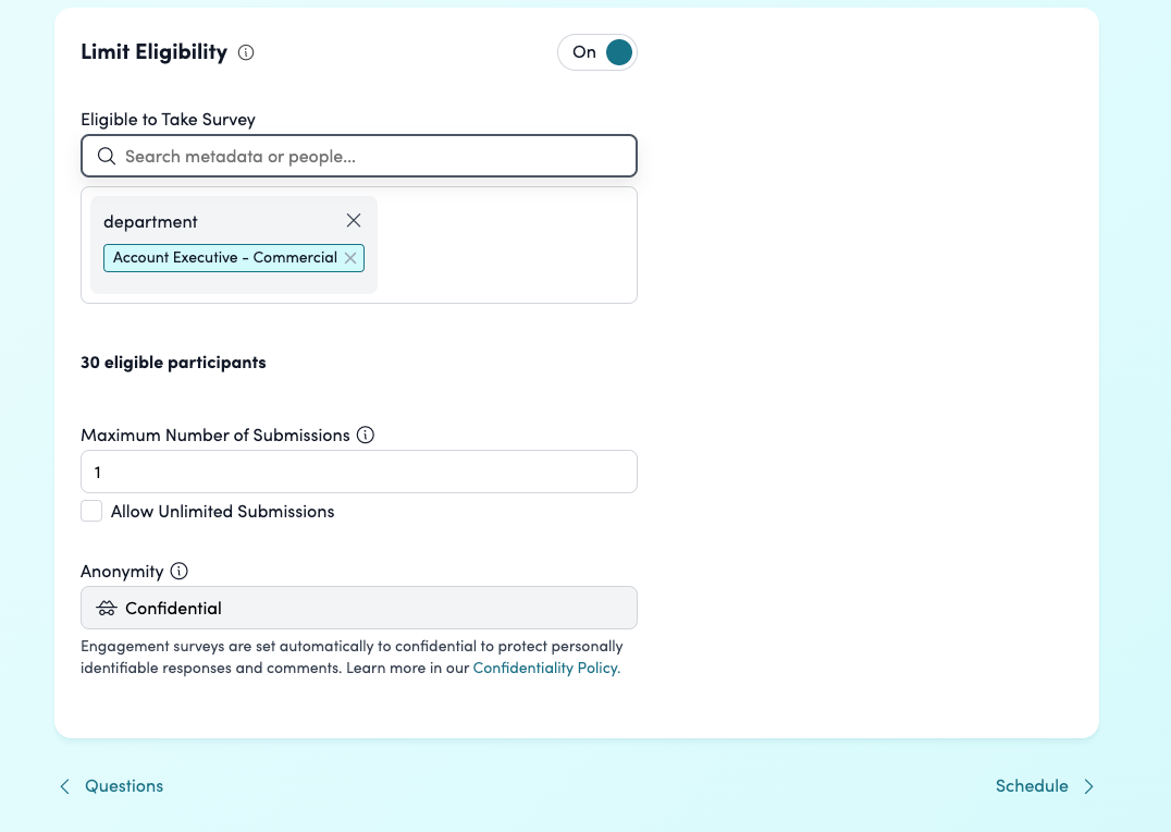 Anonymity: For Engagement Surveys, responses are always confidential to protect participant privacy. This field cannot be edited.