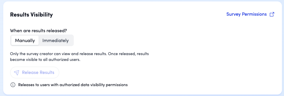 - Survey results can be set to release automatically when the survey is completed or manually based on the survey creator’s timeline. When results are released, only users with the appropriate Survey Results permissions and eligible data visibility will be able to view them.