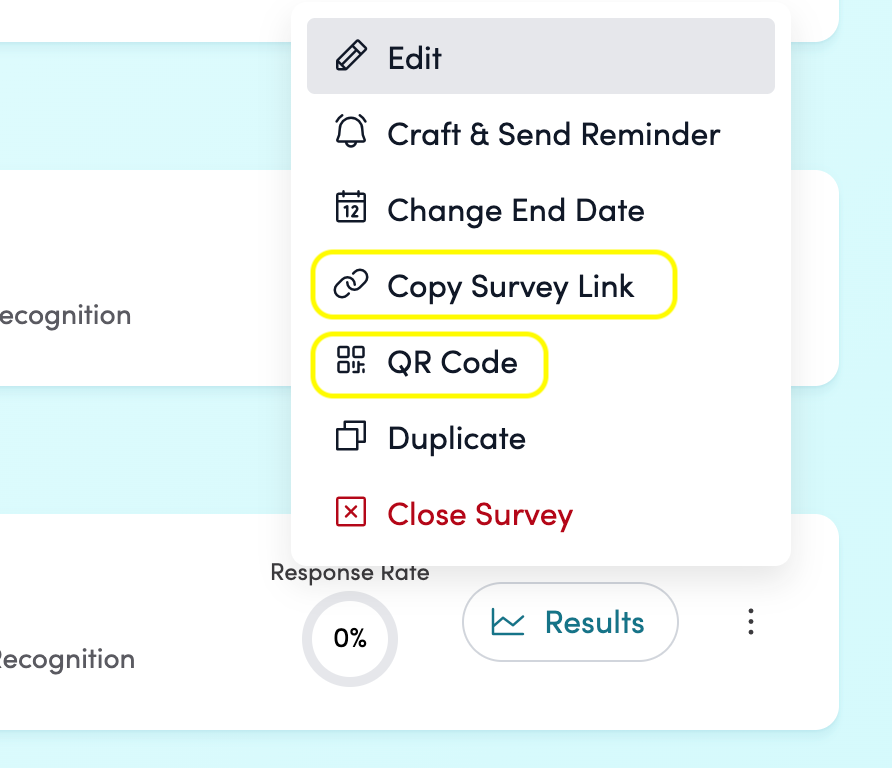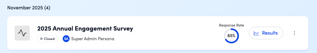 - Past Surveys: Displays surveys in "Closed" status. Response data is still accessible by clicking "Results." You can also duplicate the survey or view settings by clicking the stacked three-dot icon.