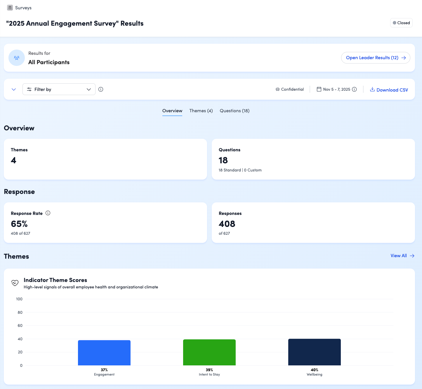 - Thematic Scoring: See how your organization scores in specific Indicator and Action Themes (e.g., Engagement, Collaboration, or Intent to Stay).