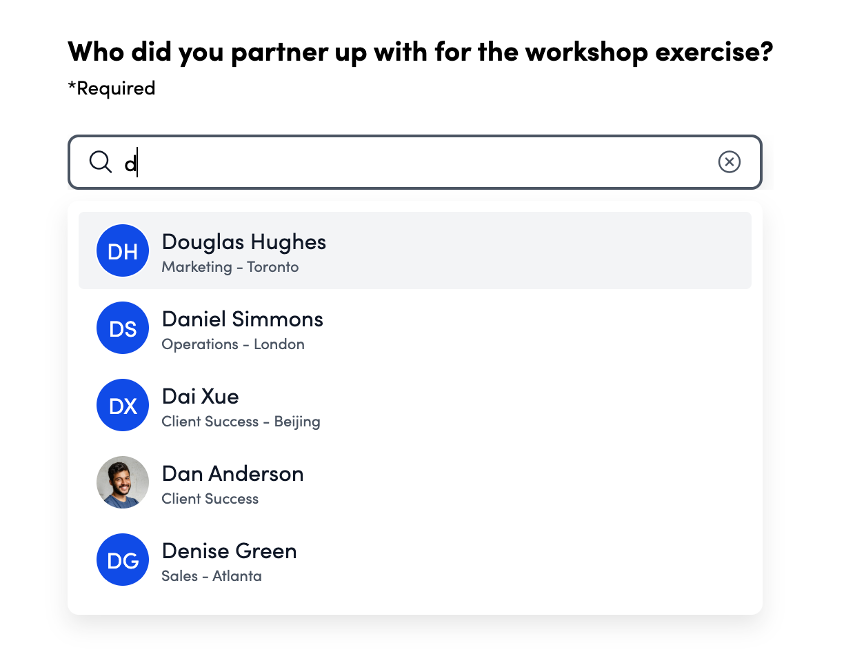 User Selection: Prompts respondents to nominate a user for a specific question.