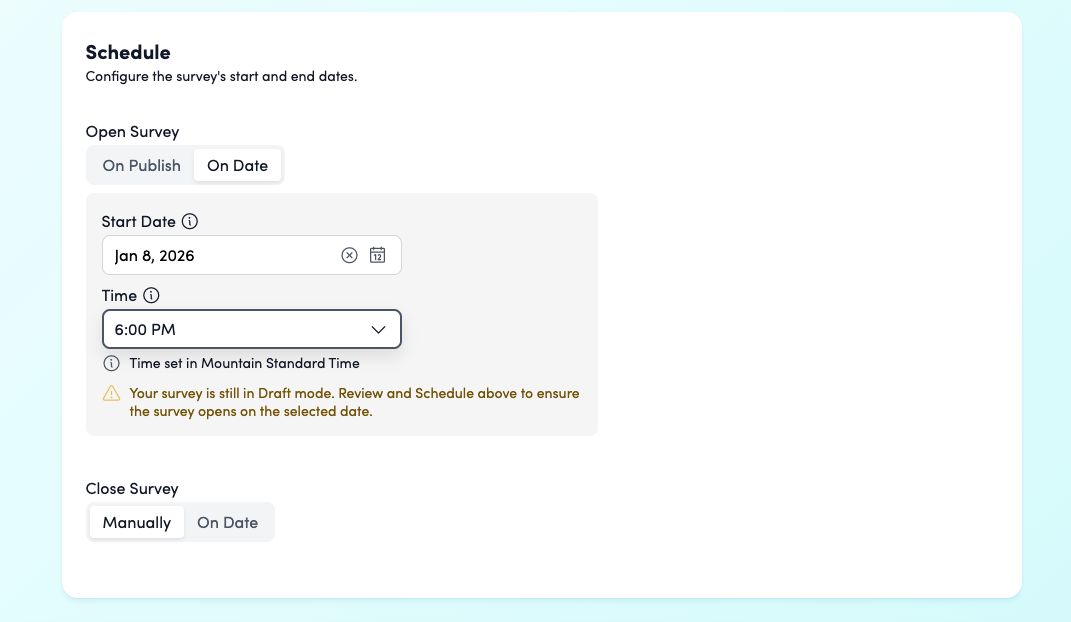 - Close Survey: Select Manually to keep it open indefinitely, or On Date to set an automatic closing time.