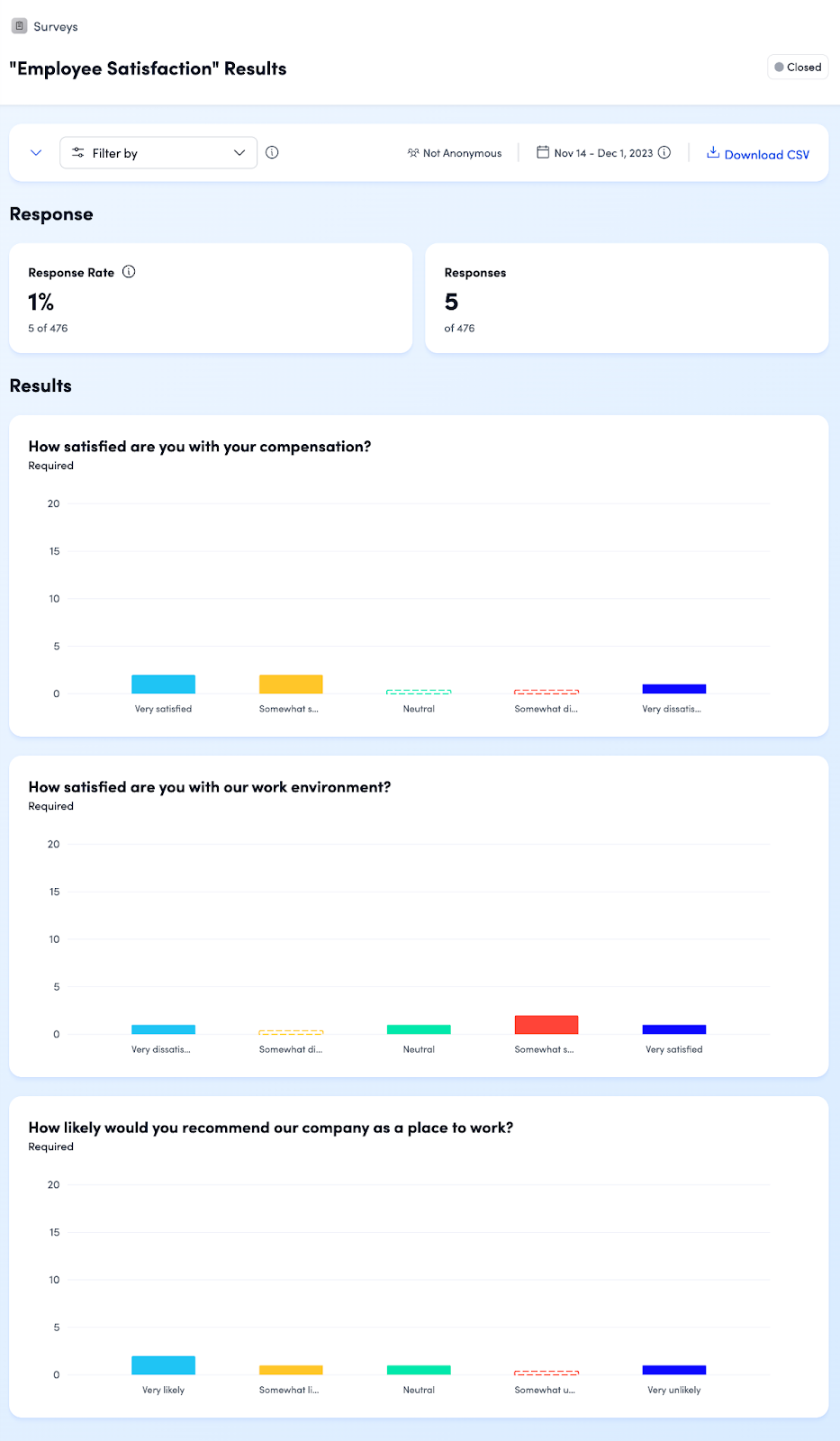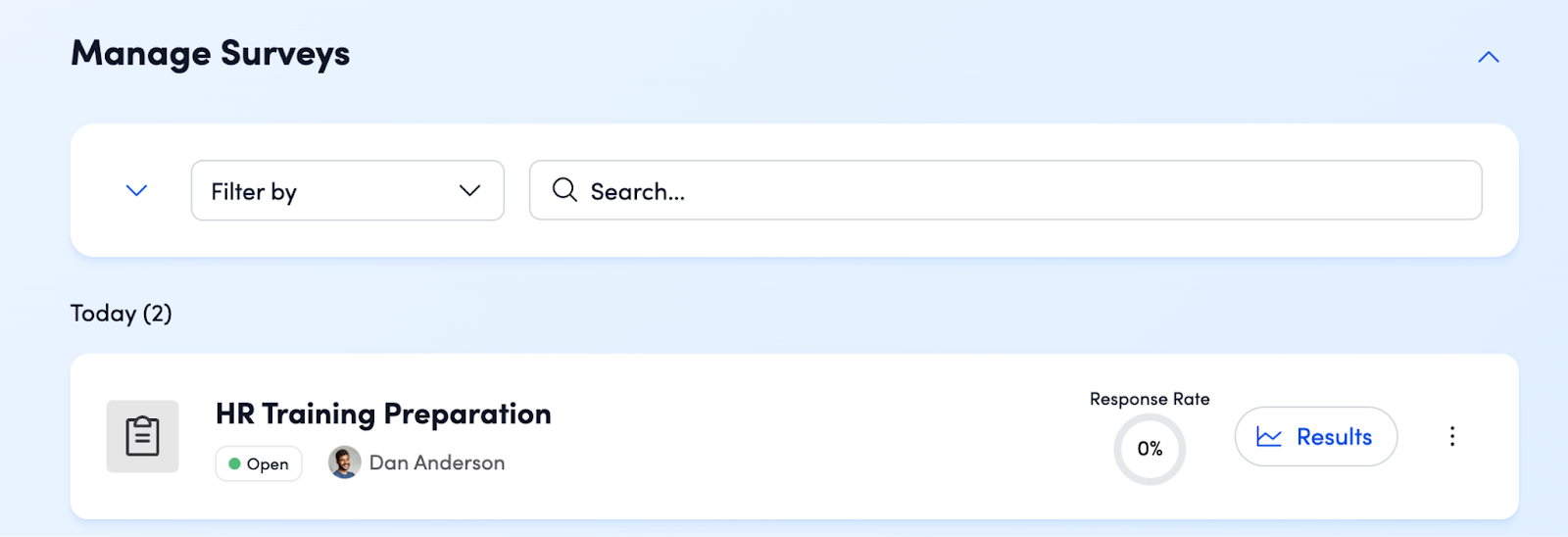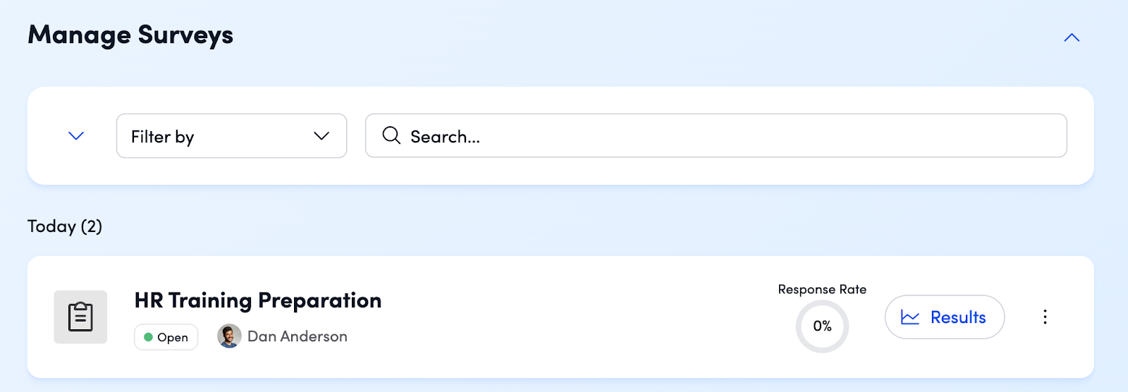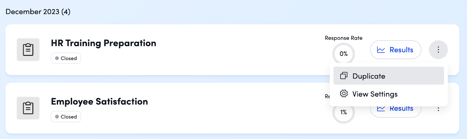 - Past Surveys: Surveys in "Closed" status appear further down the page. You can still access response data by clicking Results, or duplicate the survey by clicking the three-dot icon.