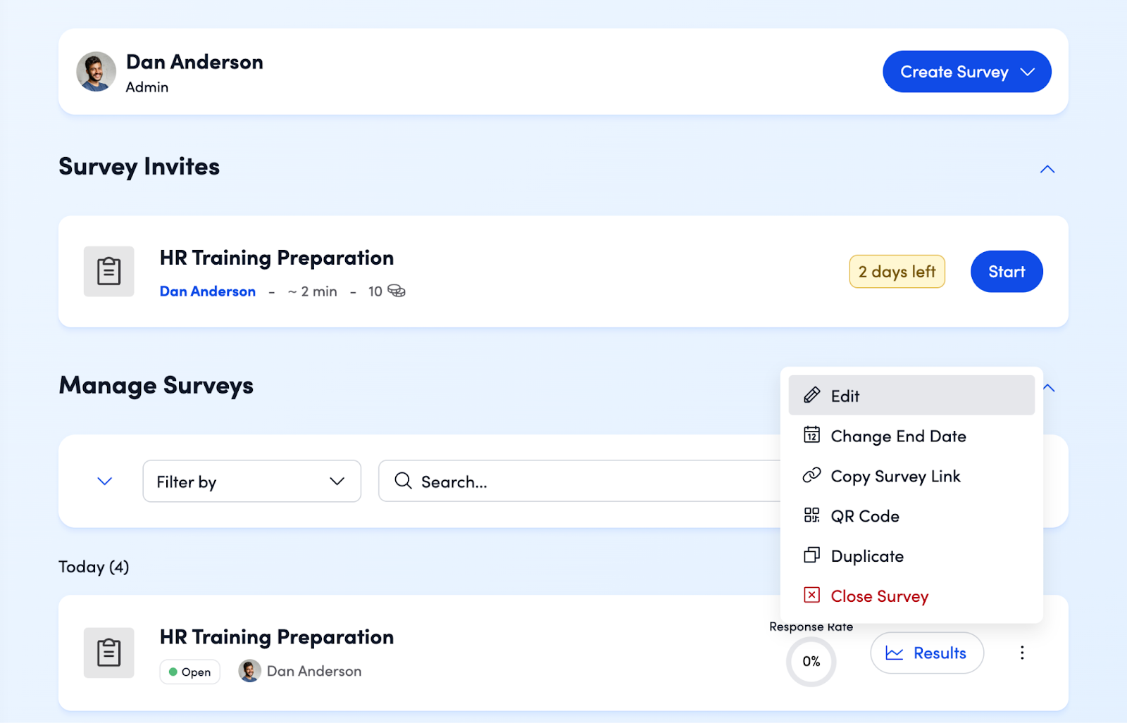 Open Surveys: Surveys with invitation notifications sent will appear under the Survey Invites section. Surveys in Open status will also display under the Manage Survey section, even if a survey invite email was not sent.