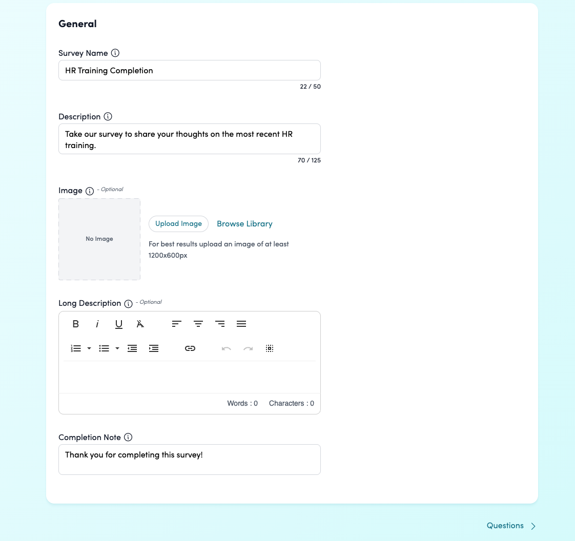 Click “Save Changes” when finished and proceed to the Questions tab.