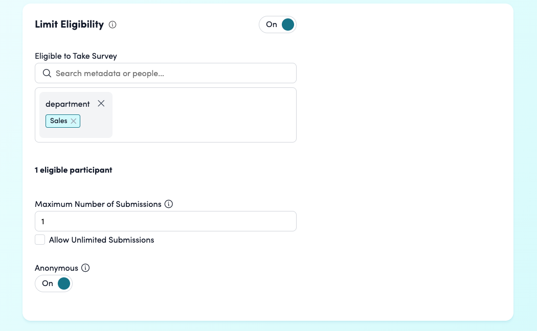 Limit Eligibility: Toggle on to restrict the survey to specific groups or individuals.