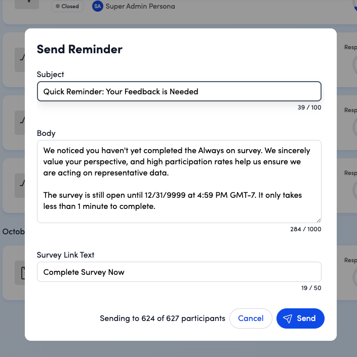- Reminders can only be sent once a survey is Live (Open Status). To send a one-off reminder: