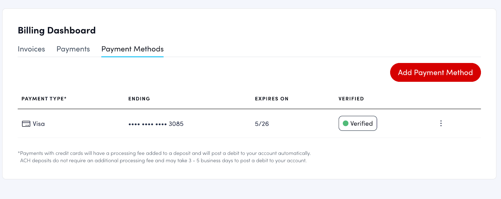 - Admins can deposit via credit card or ACH on the Billing Page ( Admin → Finance → Billing). You'll need to add and verify a payment method first.