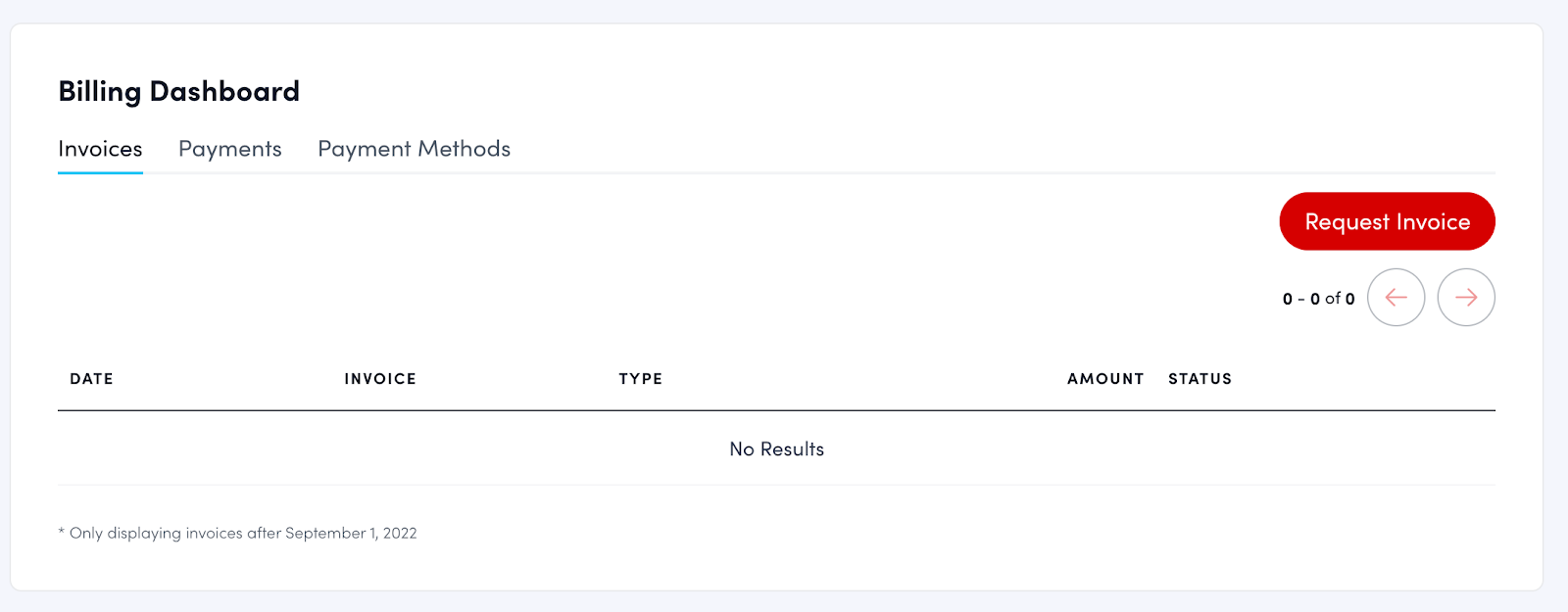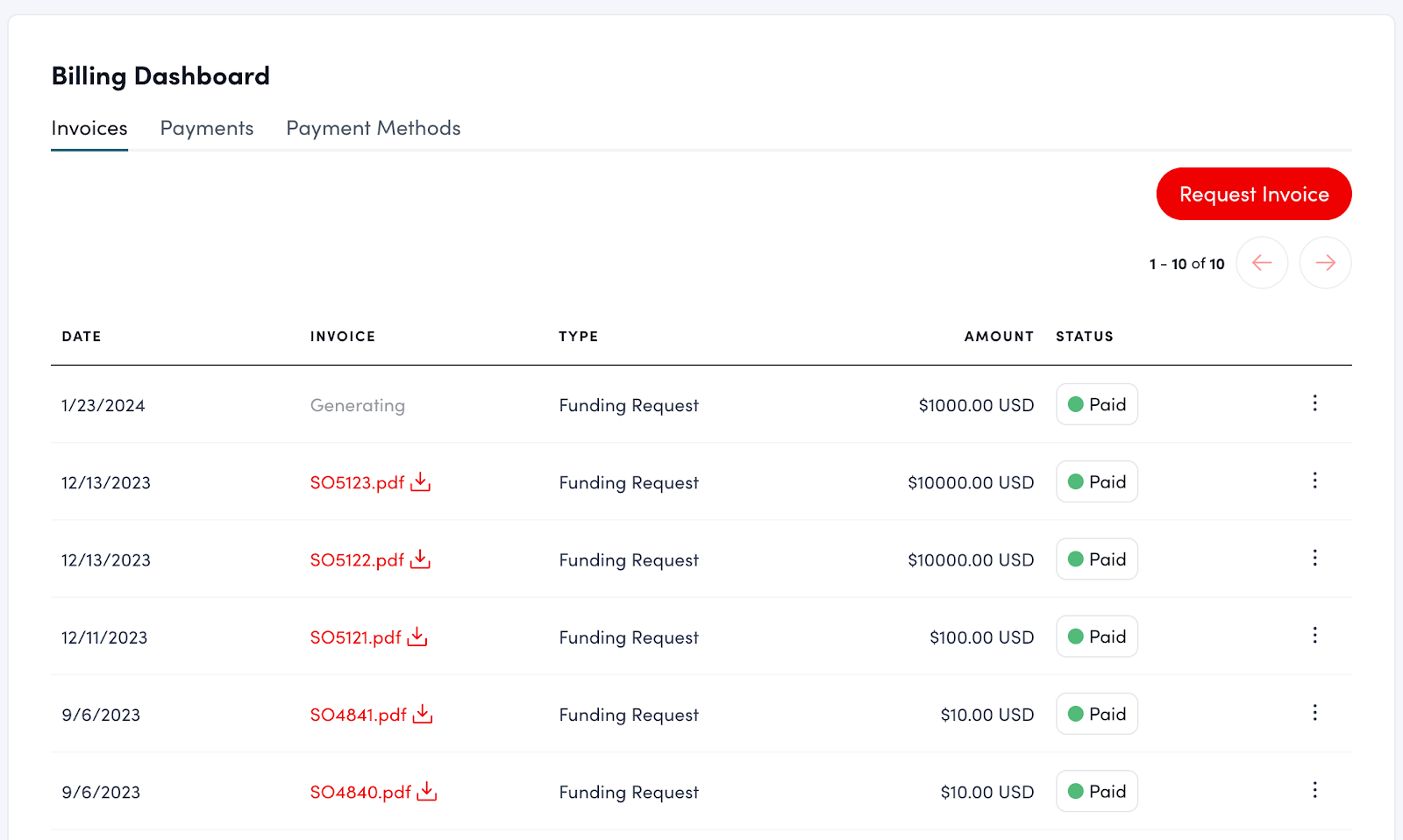 - Go to the Invoices tab to see all previously generated invoices, including the date requested, type, amount, and status.