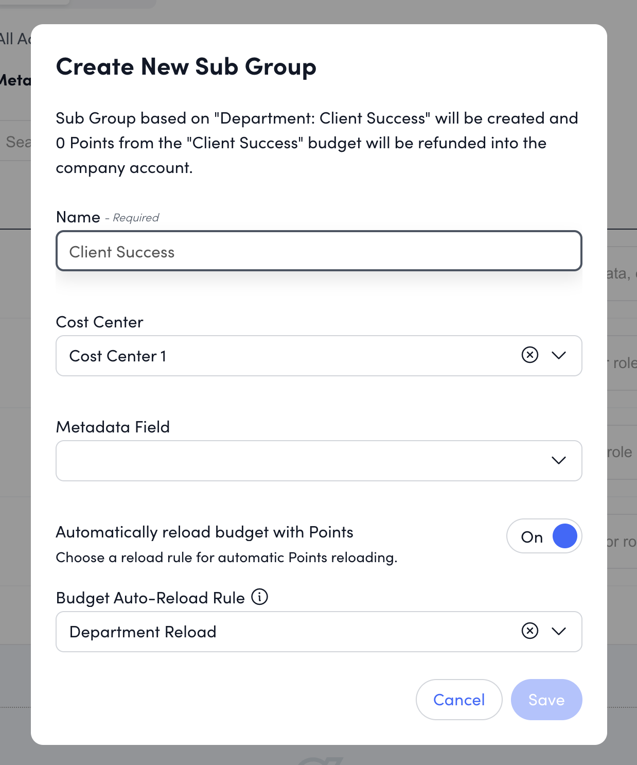 Let's say you're creating sub-group budgets within the 'Client Success' child budget. You assign this sub-group to 'Cost Center 1' and use the '#Job Level' metadata field. After clicking 'Save', three new sub-group budgets will be created for Client Success employees with Job Levels 1, 2, and 3. The points that were in the main 'Client Success' budget are now in the Company Account and need to be added to these new sub-group budgets.