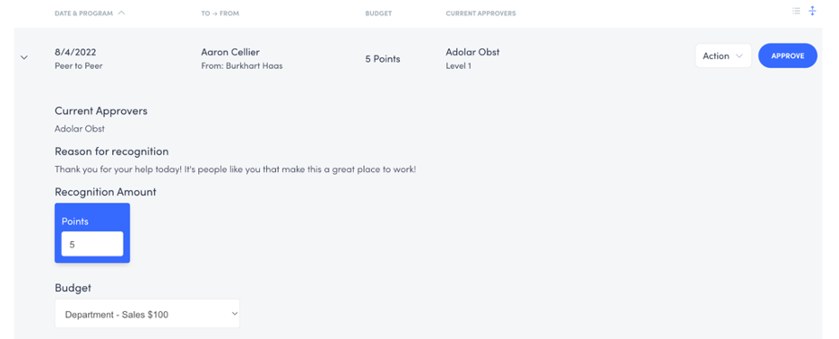 In the approvals queue, this approver is able to award points from the Sales child budget.