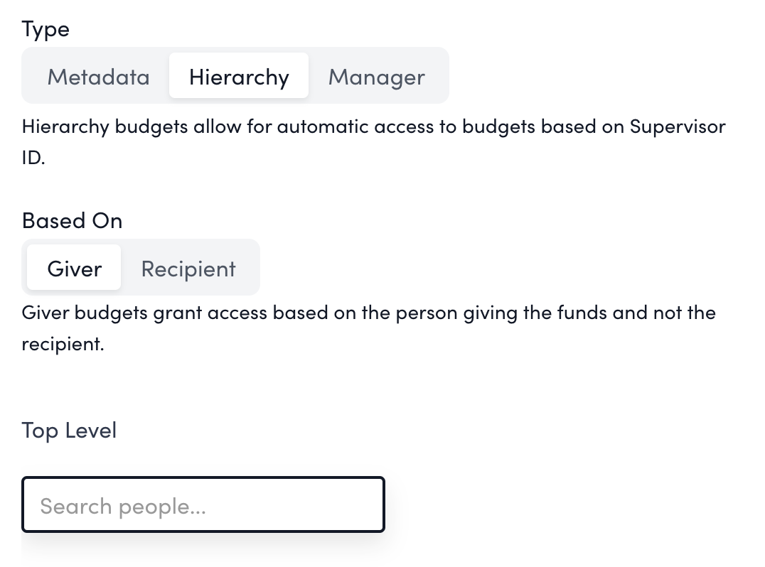 The Based On toggle determines how budget access is granted to users. You can choose either Recipient or Giver.