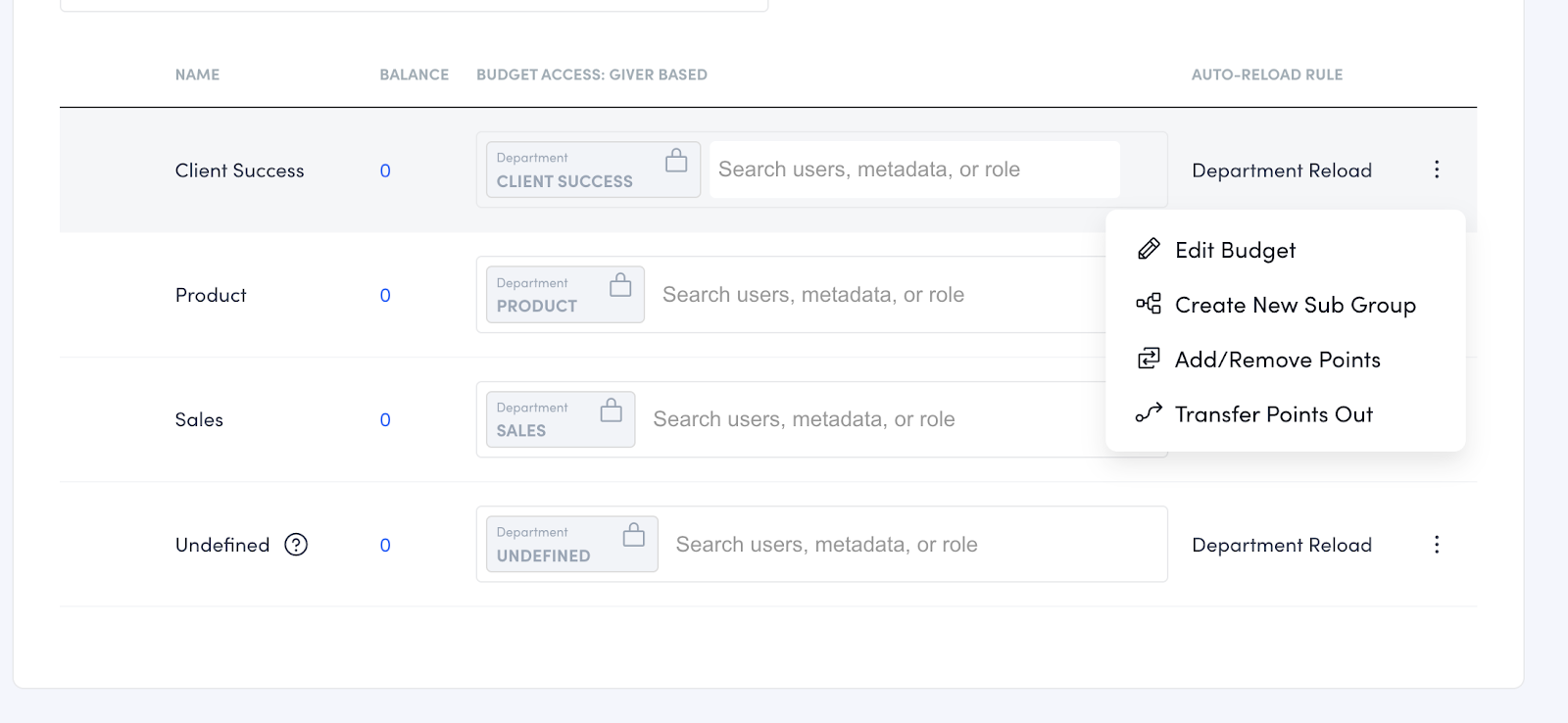 To edit a budget group's name, change its taxable status, add points, or transfer points out, click the ellipsis (three dots) to the right of the budget. Note: You cannot edit Cost Center and Metadata fields after the budget group is created.